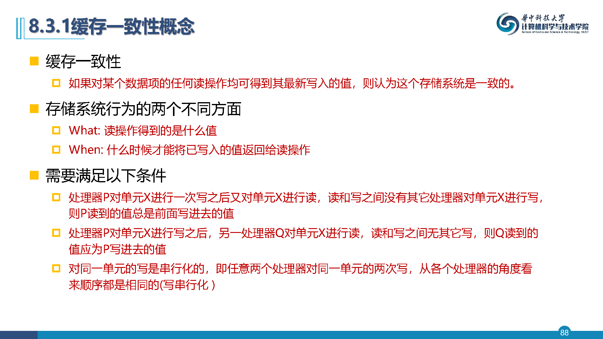当多个处理器通过共享变量进行通信时,缓存视图一致性(coherence)保证了多个处理器读到存储器内容是一致的
