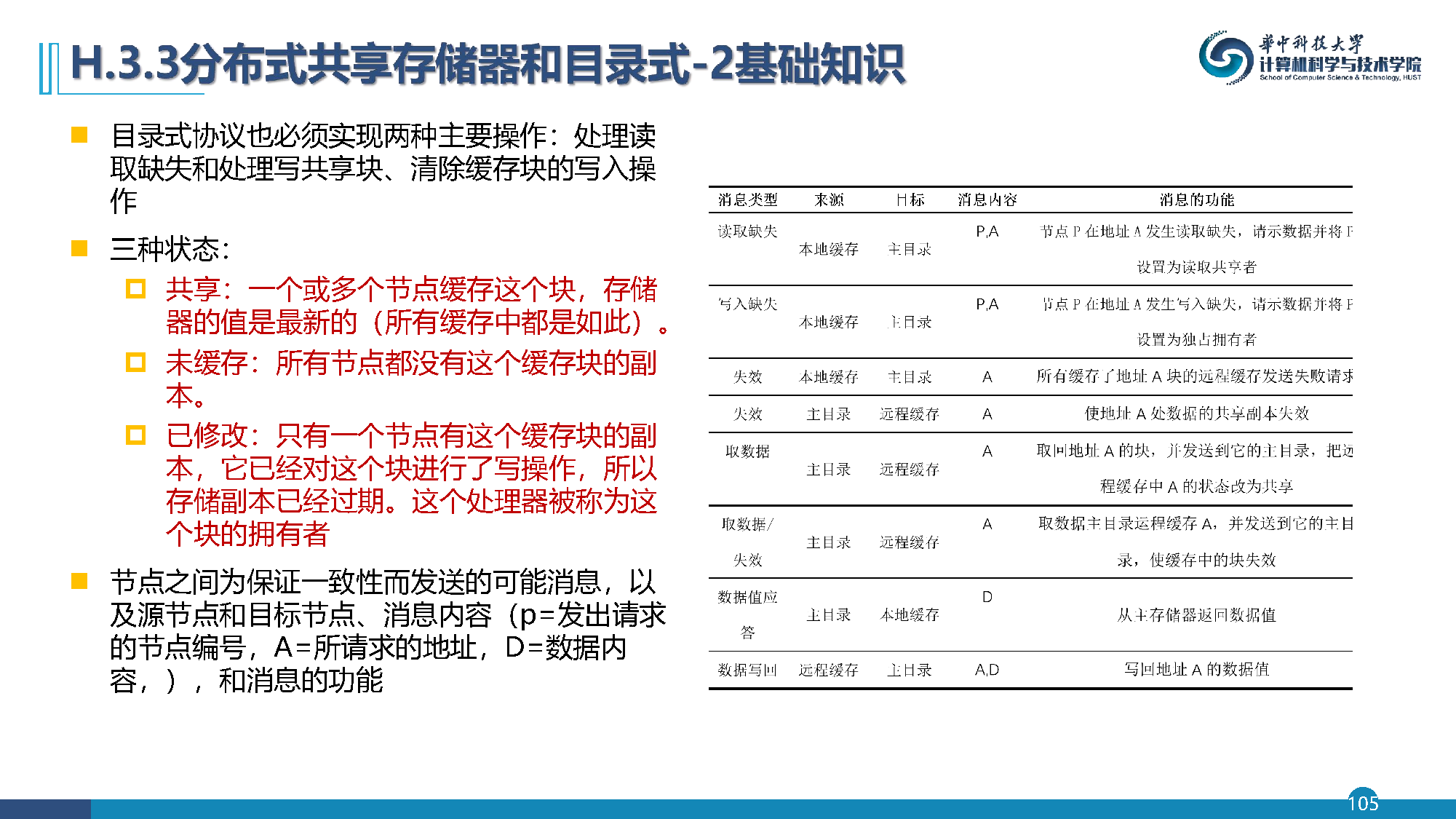 :只有一个节点有这个缓存块的副本,它已经对这个块进行了写操作,所以存储副本已经过期。这个处理器被称为这个块的拥有者