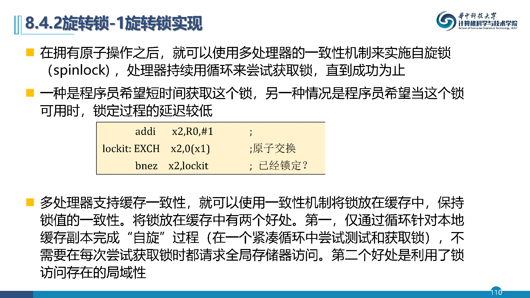 在拥有原子操作之后,就可以使用多处理器的一致性机制来实施自旋锁(spinlock)