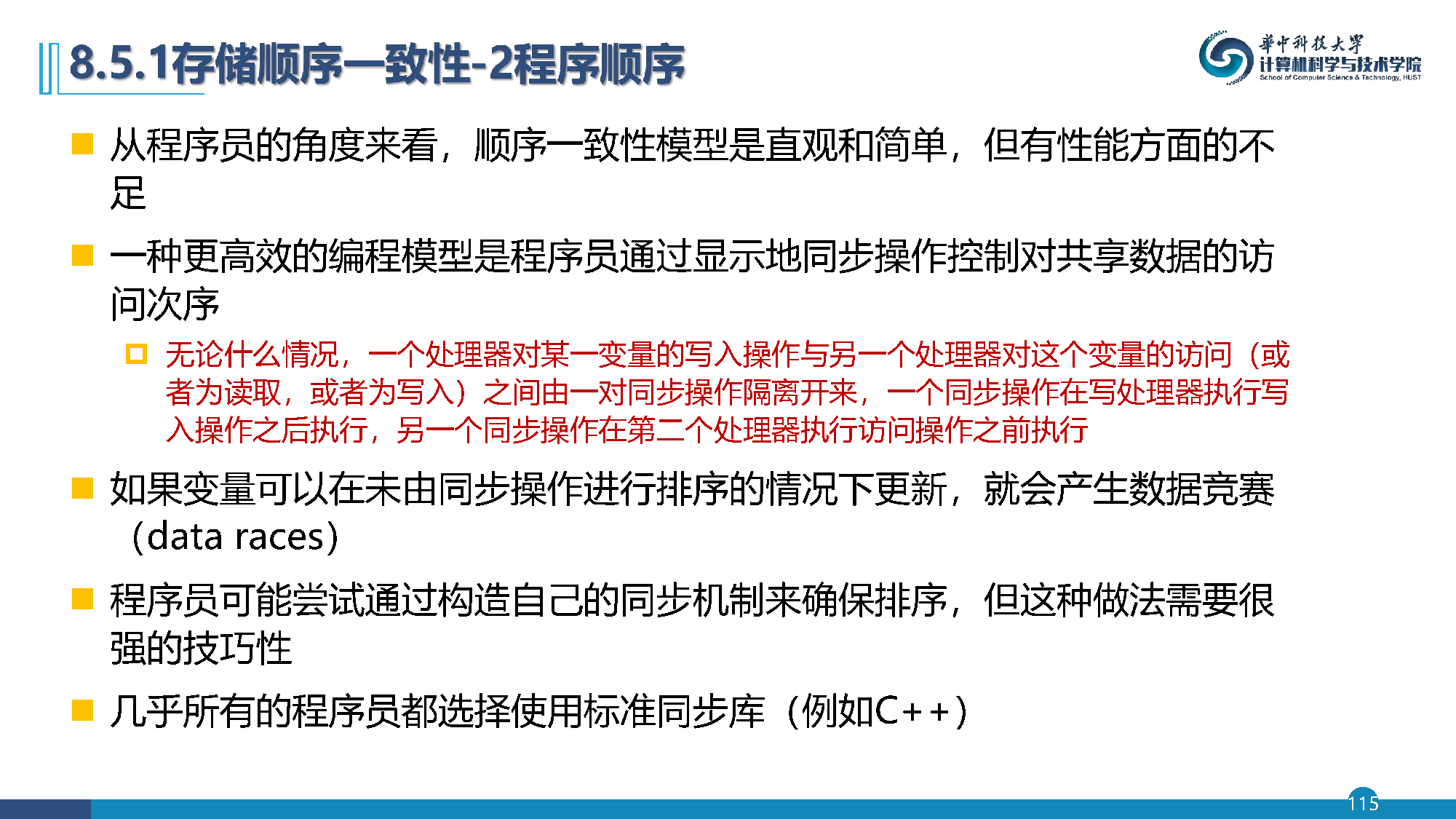 无论什么情况,一个处理器对某一变量的写入操作与另一个处理器对这个变量的访问(或者为读取,或者为写入)之间由一对同步操作隔离开来